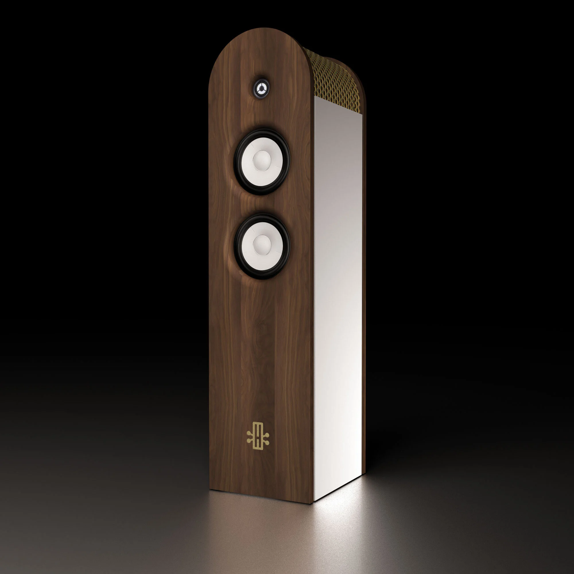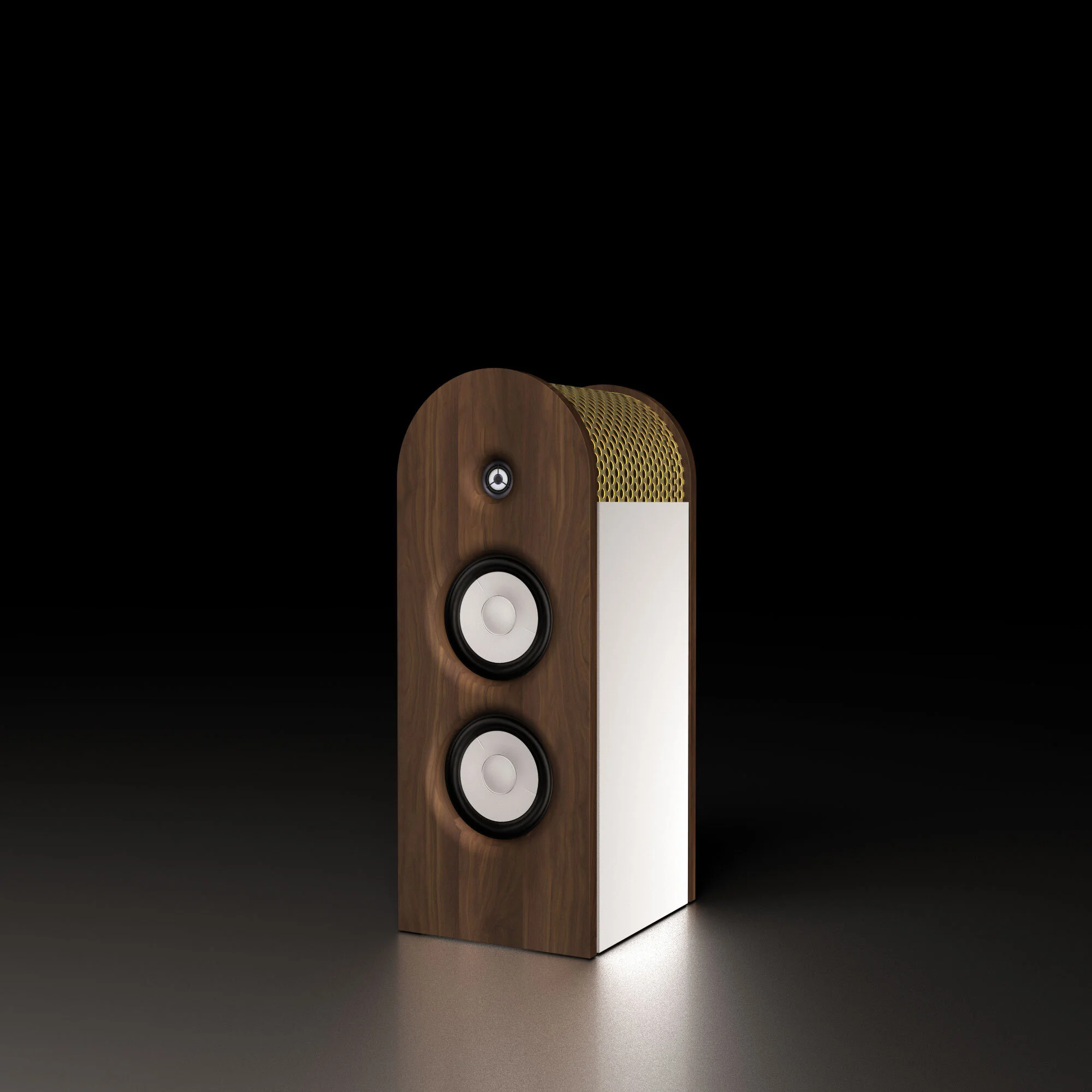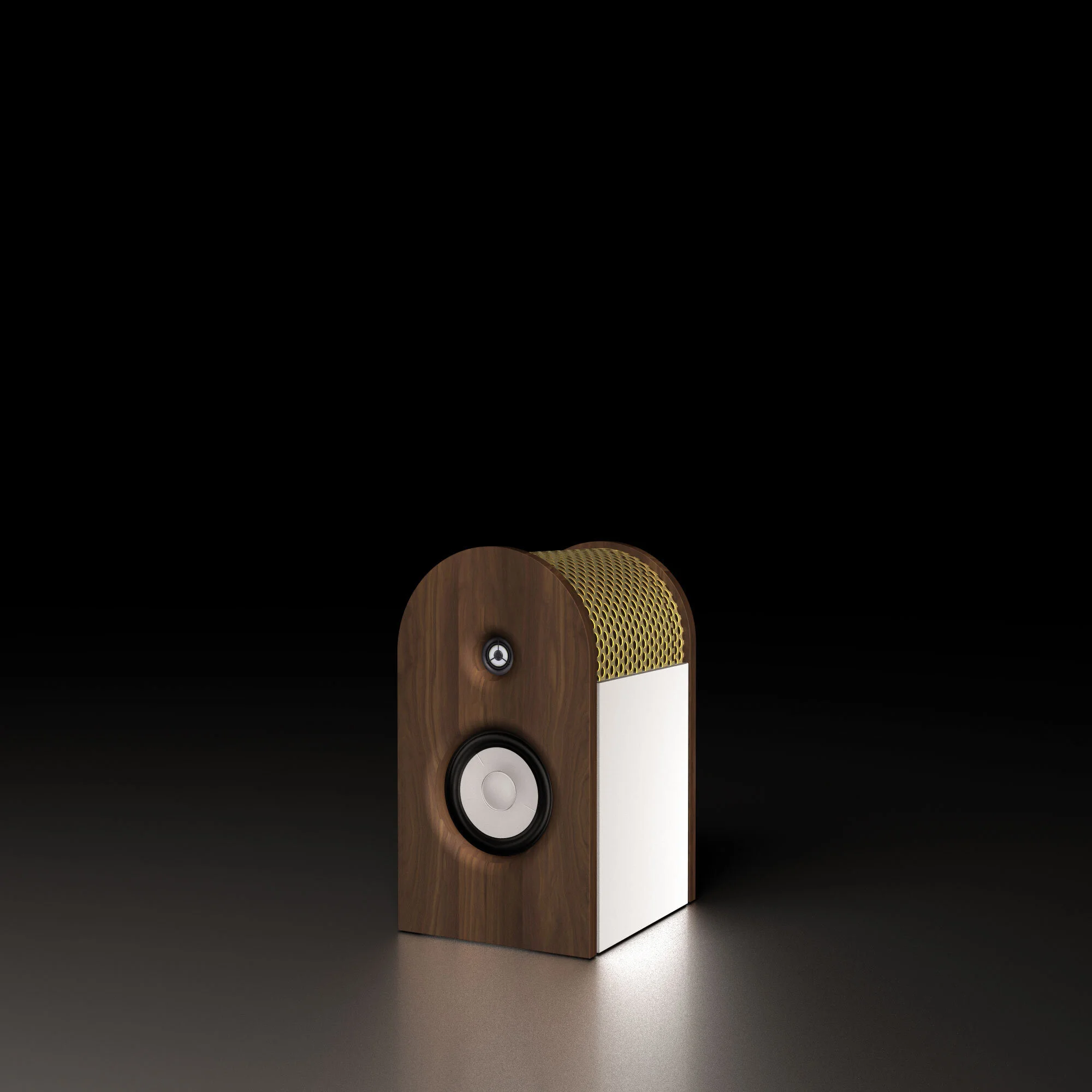 Perforated brass screening borrowed from the Flatiron speaker grills curve across the top of the “belfry” or bell tower section to encase a facade-mounted white ceramic-coated aluminum tweeter that produces the crisp & silky highs with smooth harmonic richness. An acoustically-paired 6" woofer punches satisfyingly deep & tight bass from the main cabinet.