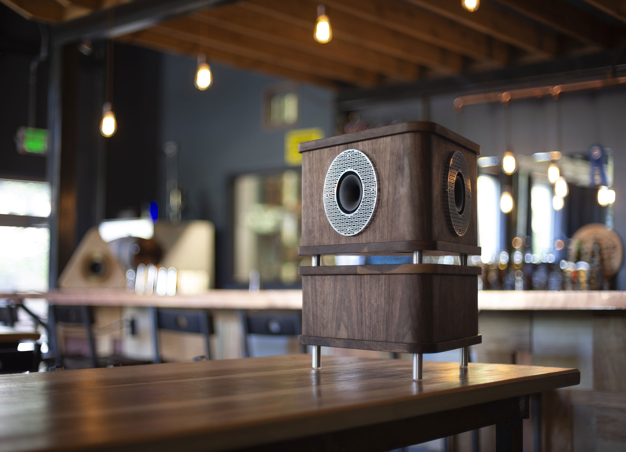 Luxurious handcrafted materials along with best-in-class audio components combine to create a big room audio listening experience unlike any other. Designed for large spaces, the main speaker drivers in the upper cabinet are angled at a perfect 120º providing optimal sound dispersion for wide spaces, while the lower cabinet houses a dedicated 8” subwoofer to fill out the bass. Powered by a prodigious 150 Watts x 2 of low distortion amplification, let the party begin!